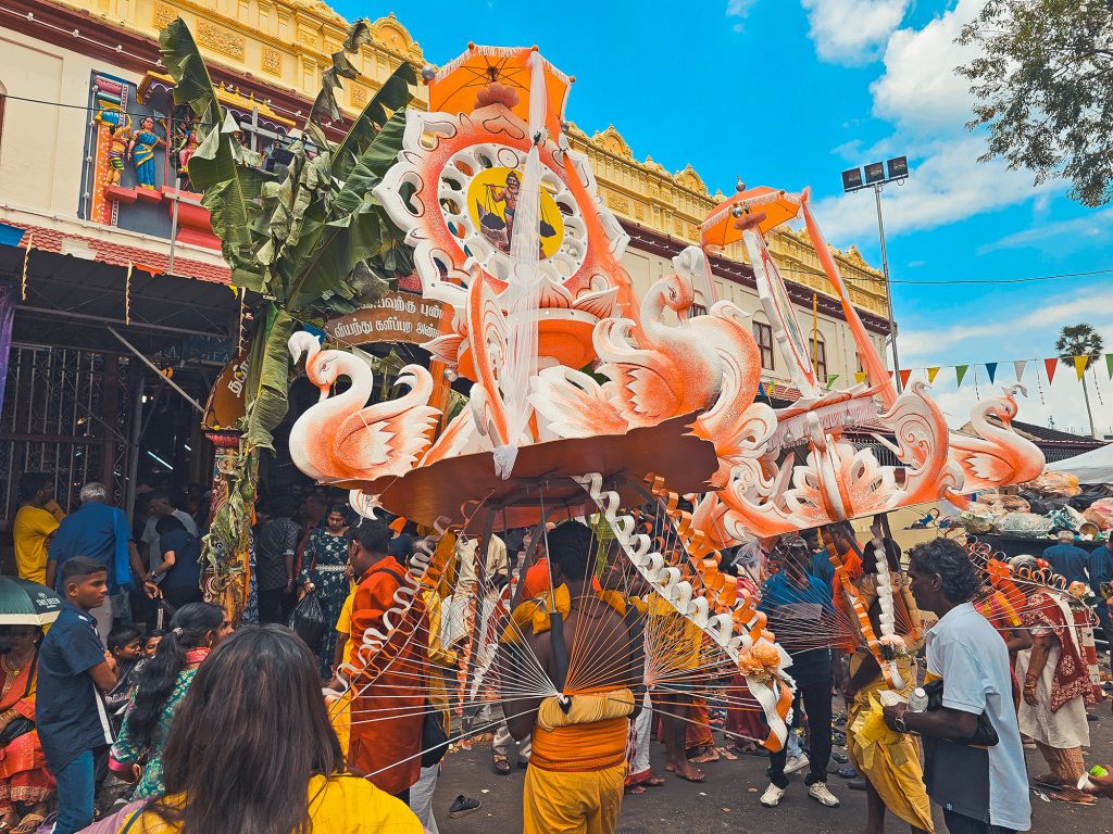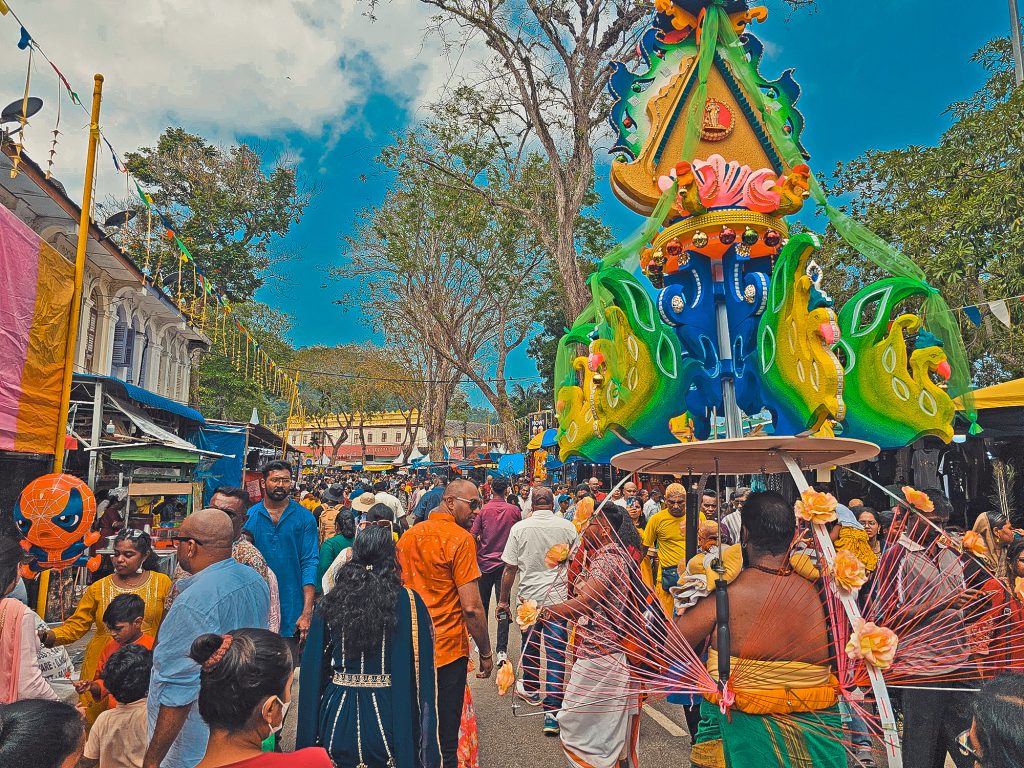 Thaipusam is a Tamil Hindu festival dedicated to Lord Murugan, marked by devotion and penance, and in Penang it’s strongly associated with chariot processions and devotees carrying kavadis (including ornate peacock kavadis). Penang’s celebrations are commonly centred around the Arulmigu Balathandayuthapani Temple (Waterfall Hilltop Temple) area, with large crowds and many “Thaneer Panthals” (refreshment stalls) along routes.