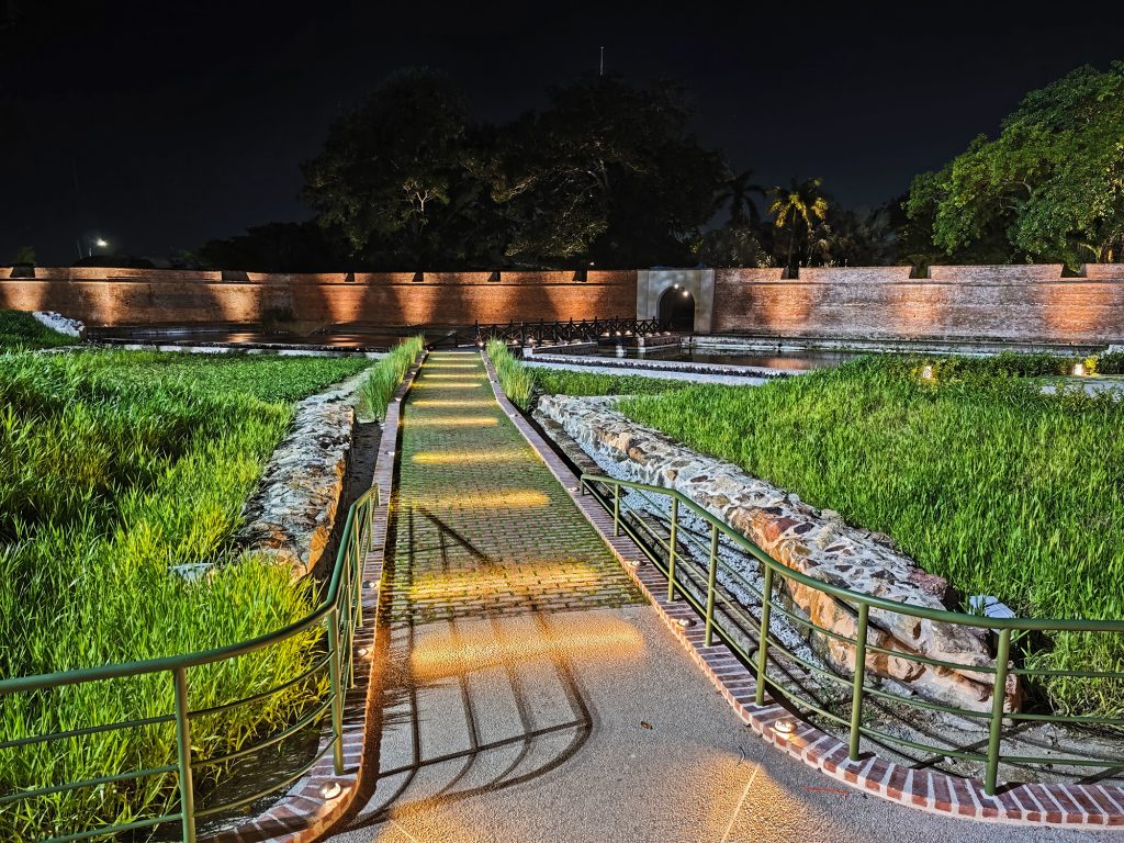 The newly restored western and southern moat at Fort Cornwallis at night. Together, both moats will form a water basin covering about 4,000 m², about 0.9 m deep, and holding roughly 3,600 cubic metres of water. The restoration uses traditional construction methods, with features like mechanical sand filters and bio-retention swales built into the design for ecological health and long-term stability. The project is part of Penang’s North Seafront Improvement Programme, with funding from the state government and partners like Think City and Yayasan Hasanah.