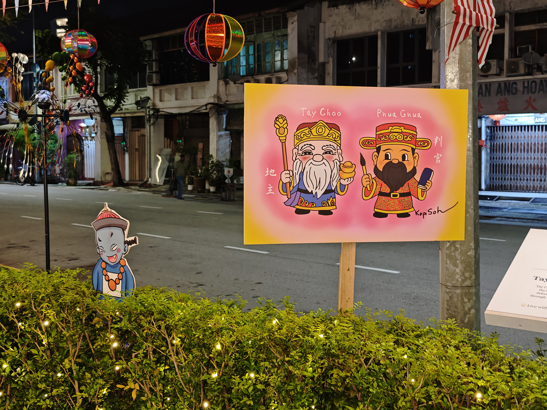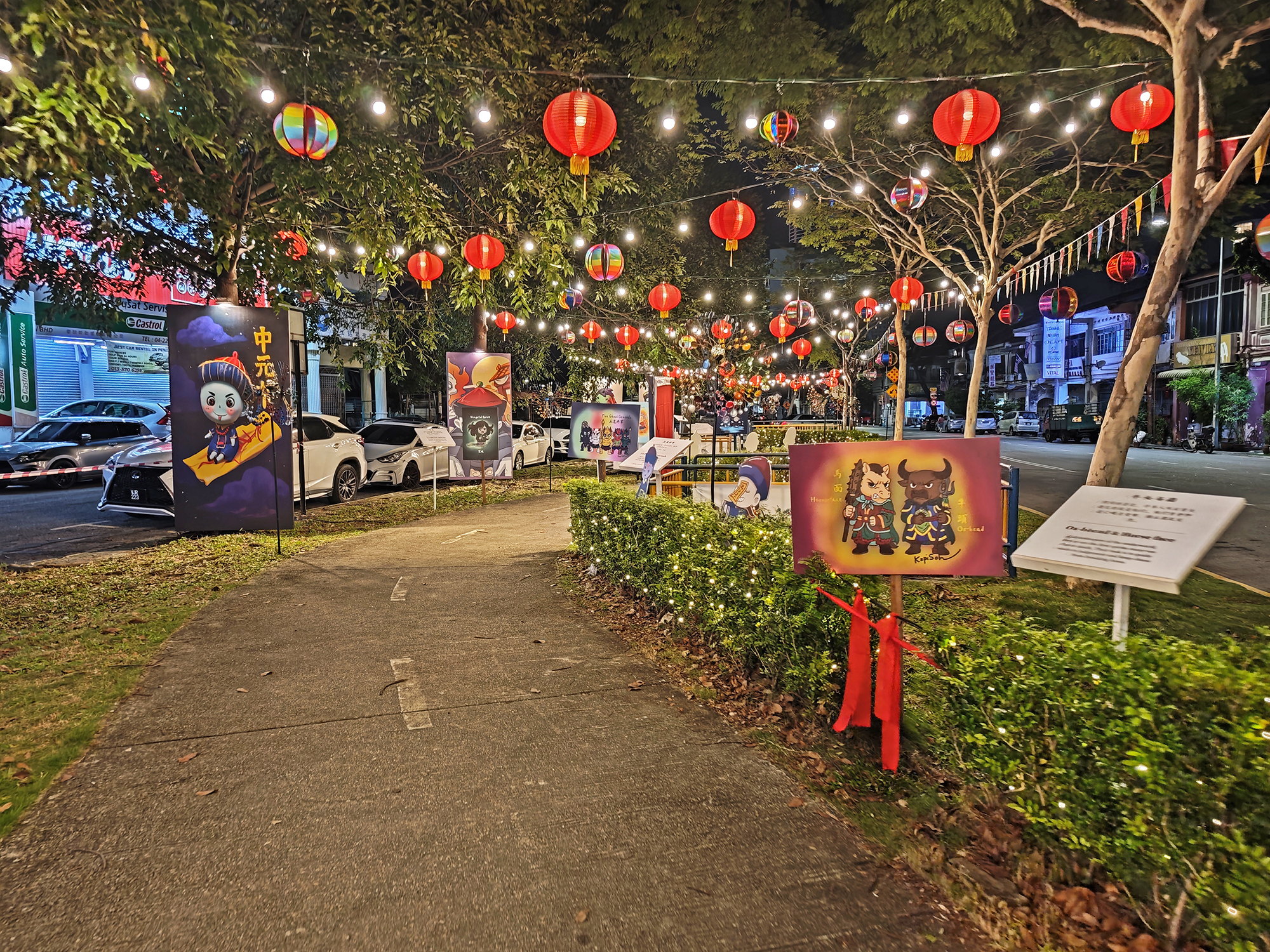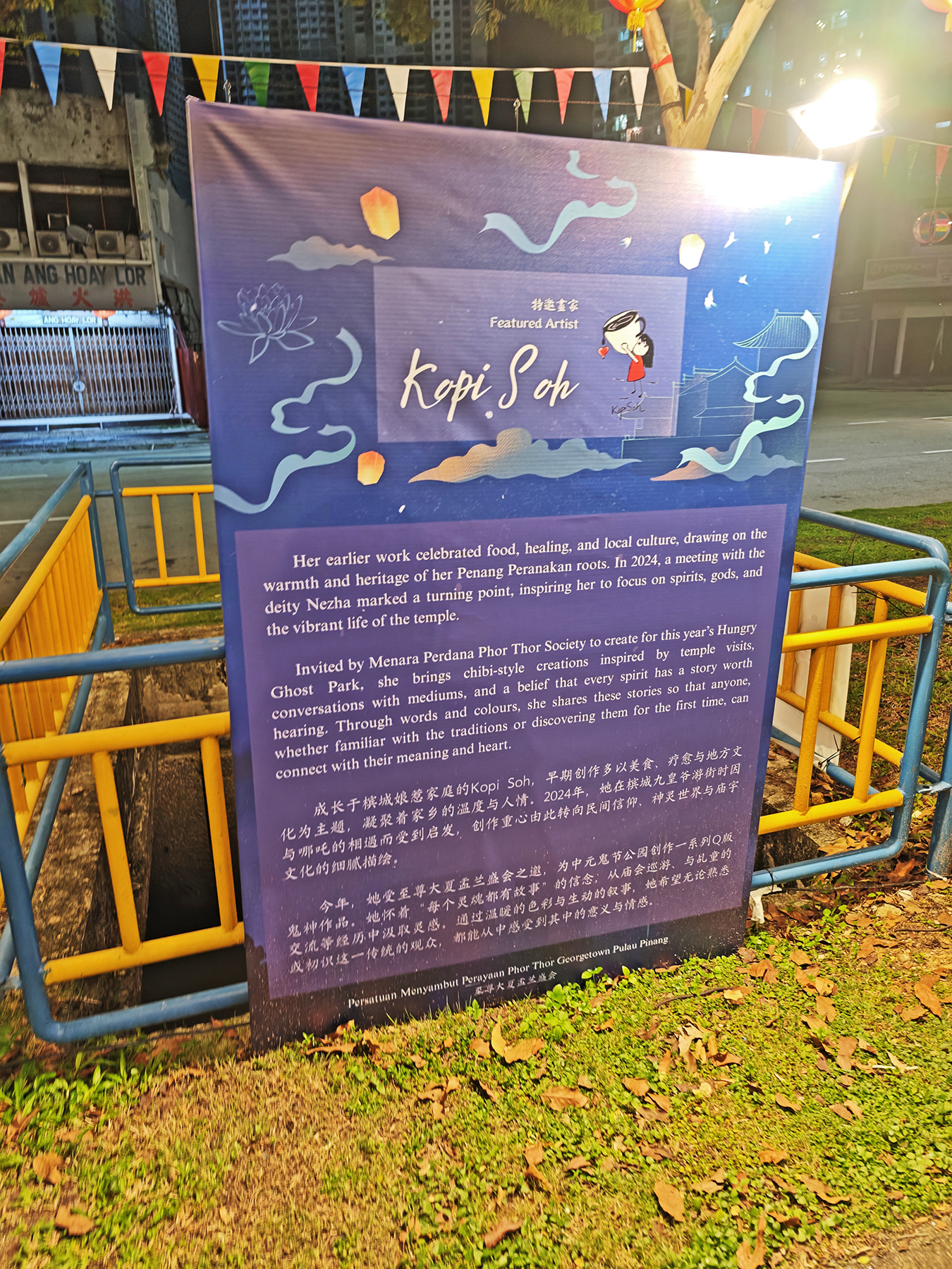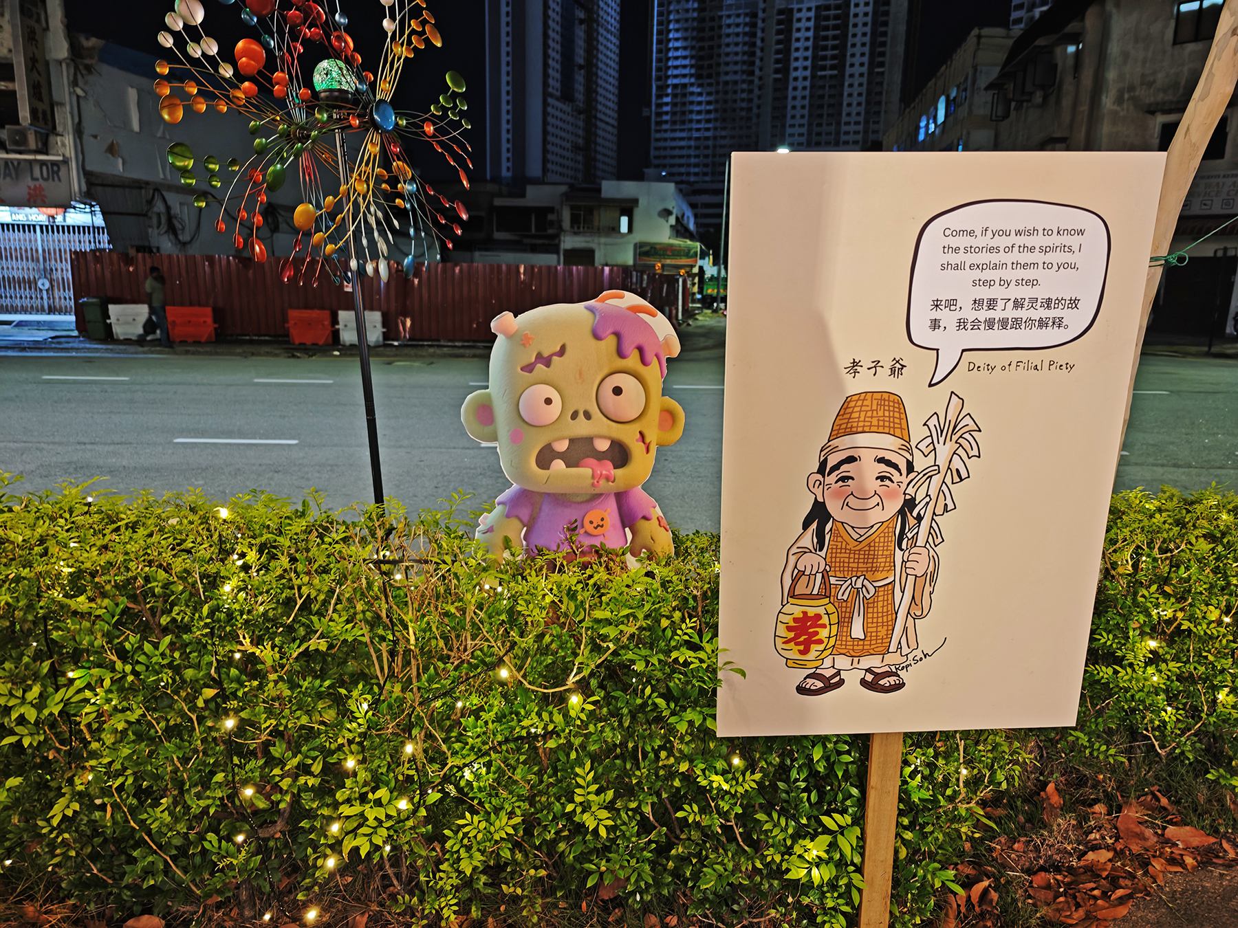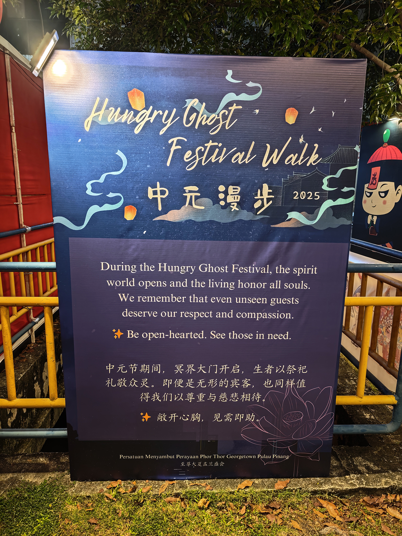 During this year’s Hungry Ghost Month, a local artist called Kopi Soh transformed a pedestrian walkway along a section of Jalan Gurdwara (Gurdwara Road), into a charming “Hungry Ghost Festival Walk,” featuring 10 adorable, comic-style illustrations of wandering spirits and deities, along with bilingual information boards about the festival’s meaning and traditions.