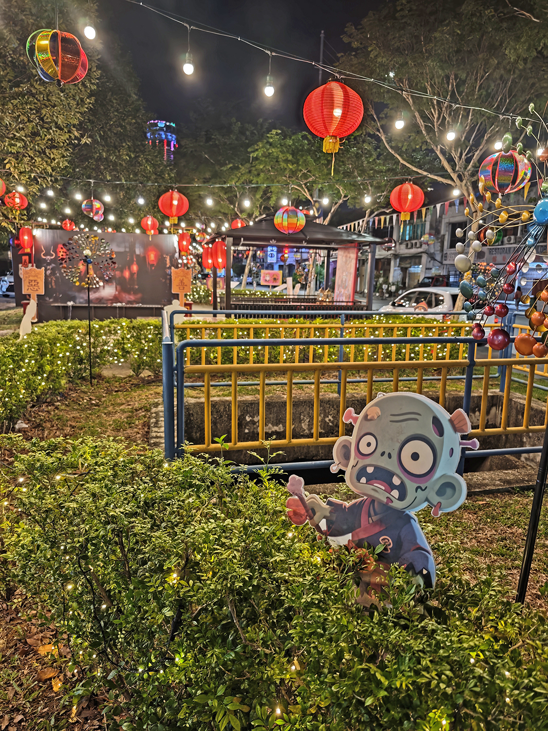 The display—adorned with fairy lights, lanterns, and colorful windmills—invites viewers to step into the festival’s true spirit of compassion, remembrance, and empathy, showing that the rituals aren’t about fear, but about honoring restless souls and helping them find peace. The installation was carried out by the Menara Perdana Phor Tor Society, with blessings from a temple and a medium to ensure the sacred art offered respect, not mischief.